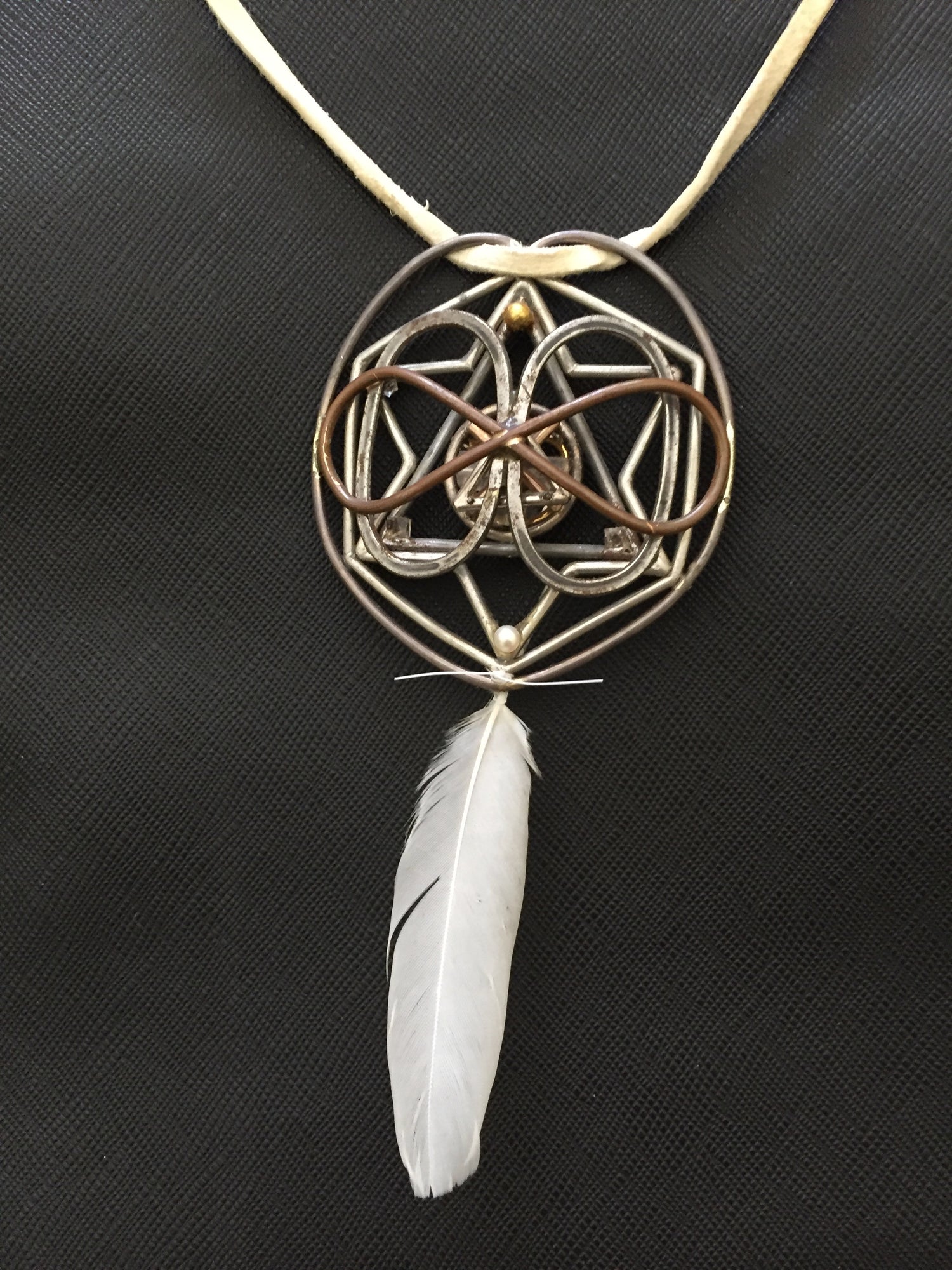 I have been inspired to create this magnificent Talisman of the energies of Heaven On Earth with the metal symbols, the white feather tied with horse hair and the five crystal geometric shapes of the Elements representing the Music of the Heavens along with the God Sphere (Male) of Gold mirrored by the Goddess Sphere (Female) of Pearl. The white feather is pointing to the Earth as a symbol of peace and of the Soul being pure as it weighs no more than a white feather. Horse hair is the Medicine of Power. You will connect with these beautiful, pure divine energies deep within your 'Aura' to Be at One and integrate them with your own unique Being through The Dance Of Life and its Connection to AureoriA.